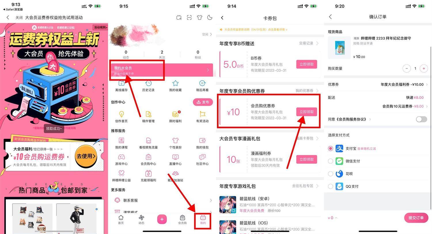 1、打開地址->跳轉到嗶哩嗶哩APP->領取10元運費券->我的->我的大會員